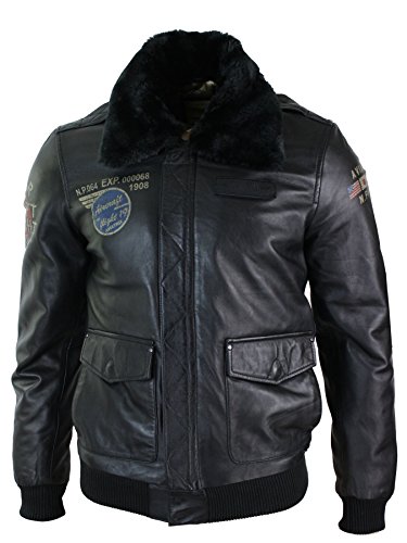 Giacca in Vera Pelle da Uomo Bomber da Pilota Aderente Nero con Colletto in Pelo nero