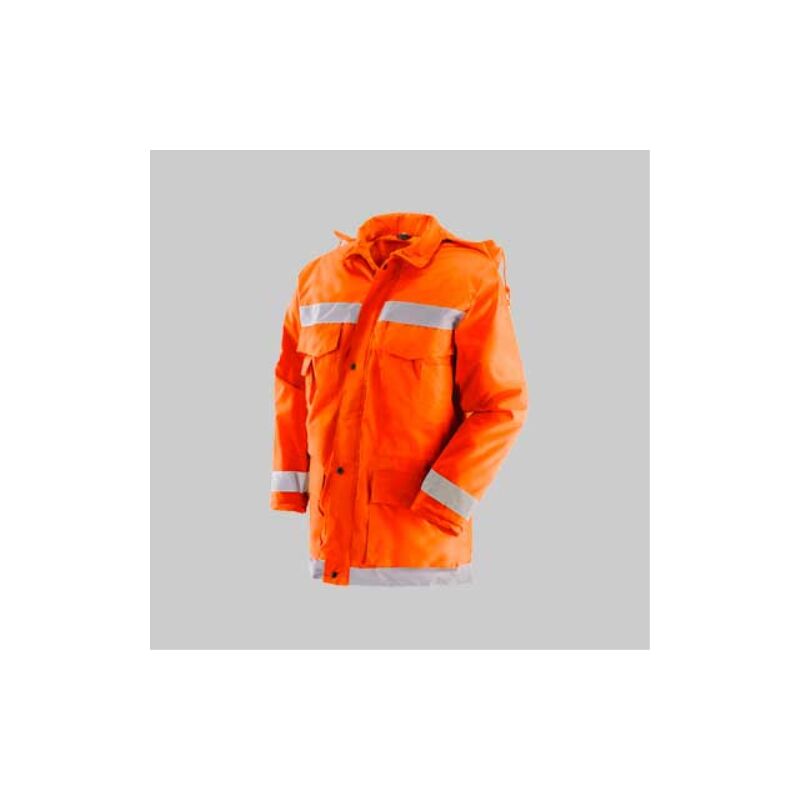 Tessuto poliestere/PVC, imbottitura e fodera interna in poliestere. Bande segnaletiche fluorescenti, chiusura con cerniera e bottoni automatici, cappuccio imbottito staccabile con cerniera. Quattro tasche esterne con patta e velcro, tasca interna, taschino porta cellulare. Colore arancio. Giaccone alta visibilita' tg. xl Abbigliamento alta visibilita'