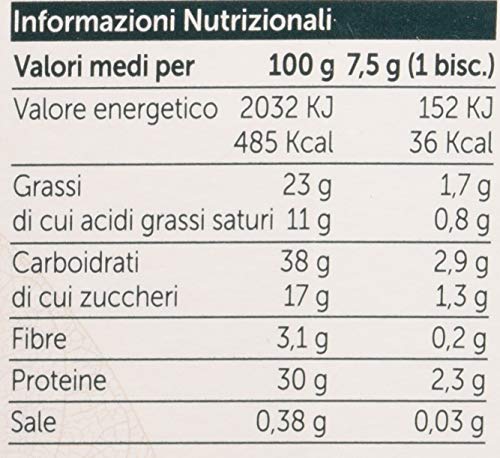 Valori nutrizionali medi per 100grammi: calorie 485 kilocalorie, grassi 22 grammi, proteine 30 grammi