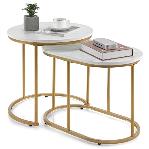 GIANTEX Set di 2 Tavolini da Salotto in Marmorizzato Oro, Tavolino da Divano, Tavolino da Caffè dal Design Moderno, Comodino, Telaio in Metallo Dorato