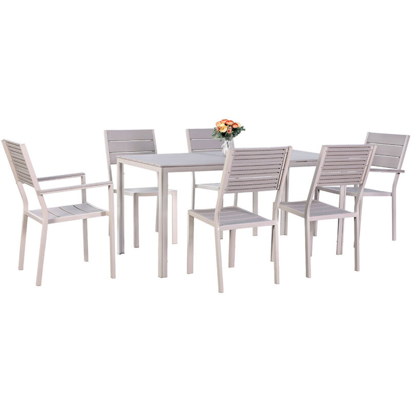 Struttura in tubo di acciaio. Composto da 2 sedie con braccioli (frontale sezione mm 20x40x1 - posteriore sezione mm 20x30x1) da cm. 58x55,5,5x88,5, 4 sedie senza braccioli da cm. 57x45,5x88,5 (sezione mm 20x30x1), 1 tavolo da cm. 156x78x74 a piano in HDPE.