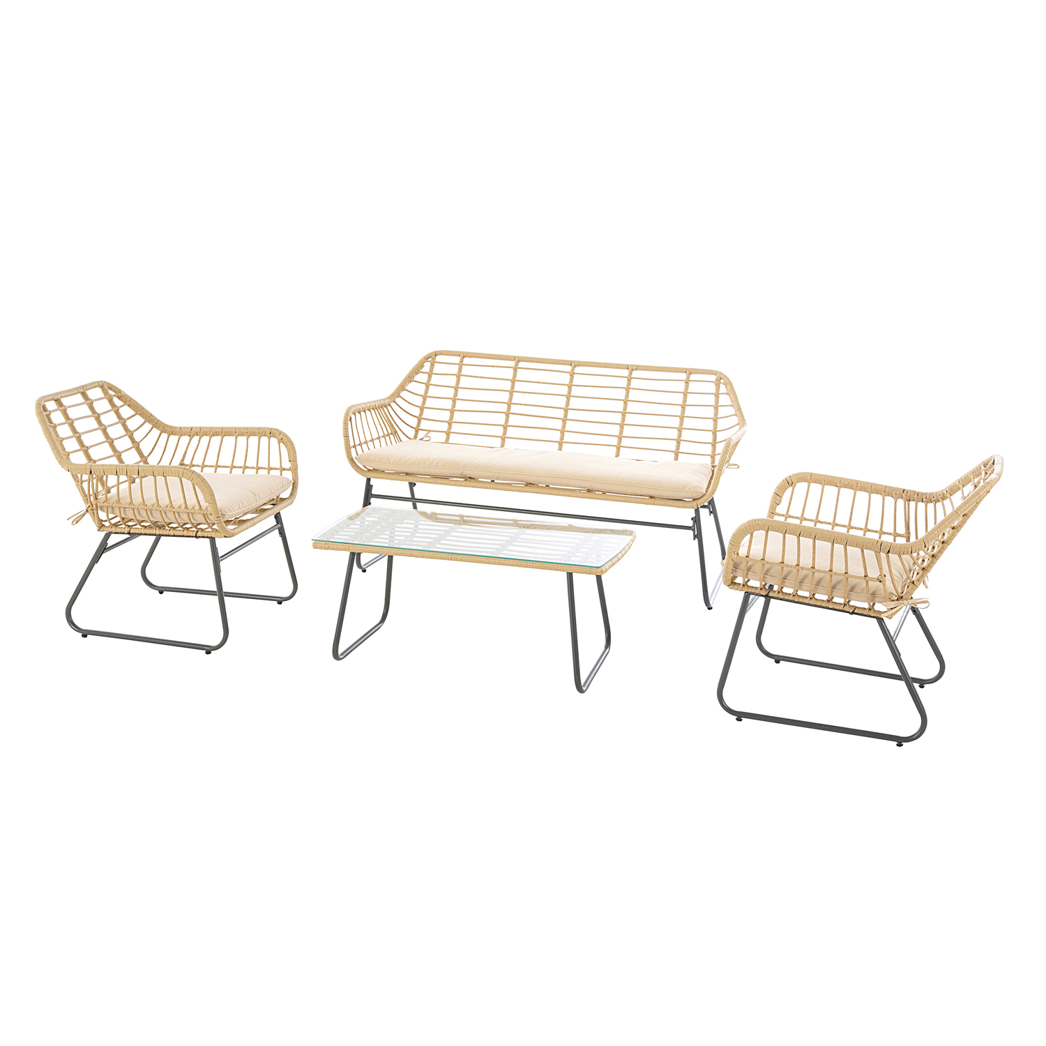 Lambada è la linea di mobili da esterno in stile rattan che dona raffinatezza e un tocco naturale ai tuoi spazi all'aperto. Con questo set arredo potrai creare un soggiorno ricco di stile in giardino. I telai sono realizzati in acciaio trattato a polvere per evitare ruggine e sbiadimento dei colori, mentre i cuscini delle sedute in tessuto idrorepellente sono provvisti di cerniera per sfoderarli e lavarli facilmente. Grazie ai lacci i cuscini non scivolano dalla seduta e garantiscono la massima comodità e stabilità. Il set si compone di divano 2 posti, 2 poltrone con braccioli e tavolino coordinato con piano in vetro temperato per appoggiare drink, riviste e oggetti da avere a portata di mano. Ogni elemento ha piedini regolabili per la massima stabilità su qualsiasi tipo di pavimento. Il set è da assemblare seguendo il kit di istruzioni. Misure: divano 2 posti 140x69xh75 cm, poltrona 67,5x67x75 cm, tavolino 92x45xh40 cm. Altezza seduta con cuscino: 45 cm, altezza bracciolo: 63 cm.