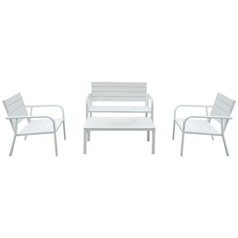 Composizione: 2 sedie con braccioli da cm. 60,5x60,5xh.76, 1 divanetto da cm. 118x65,5xh.76, 1 tavolino da cm. 98x48xh.39. struttura portante in metallo verniciato e doghe in composito di resine termoplastiche ad effetto legno.colore bianco