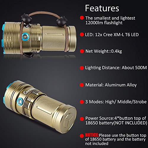 Giarebeam Torcia impermeabile LED 12000 lumen 12 x CREE XM-L T6, torcia con funzione difesa personale, 3 modalità d'uso, faro, riflettore, torcia portatile tattica, ideale a casa e all'aperto