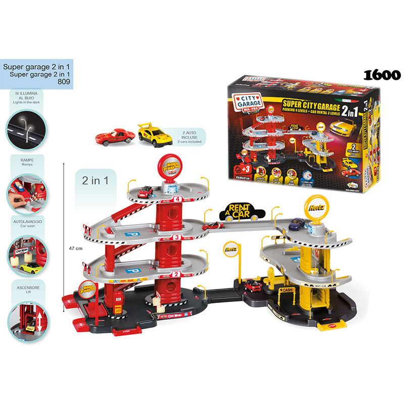 Un must per tutti gli appassionati di auto, un noleggio e garage giocattolo tutto in uno. Dotato di: - ascensore, - stazione di autolavaggio - due rampe di collegamento attraverso un autonoleggio su 3 livelli. - Si illumina al buio e contiene 2 macchinine.