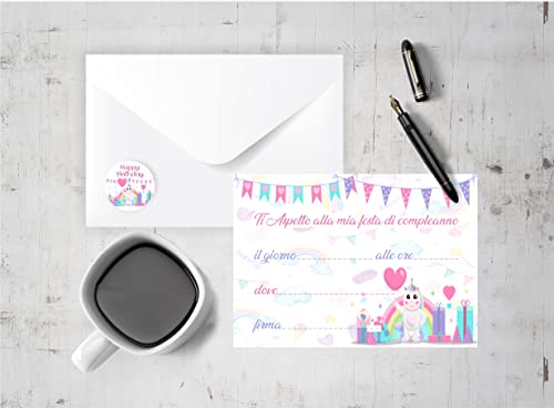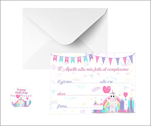 Gicaprice 10 INVITI PER FESTE DI COMPLEANNO + 10 BUSTE + 10 ADESIVI A TEMA (Unicorno)
