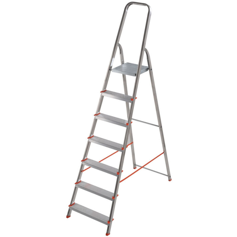 Scala casalinga Scalamia 7 gradini Scala casalinga Scalamia. Struttura in alluminio Rinforzi posteriori per maggiore sicurezza Piattaforma in acciaio con il blocco antiapertura Numero di gradini/pioli: 7 Dimensione prodotto chiuso con imballo: 217x51x12 cm Altezza da terra gradino più alto: 141 cm Altezza massima di lavoro: 340 cm Peso prodotto senza imballo: 6,2 kg Portata max: 150 kg Garanzia: 5 anni Certificazione/norma: EN 131 D. Lgs. 81/08