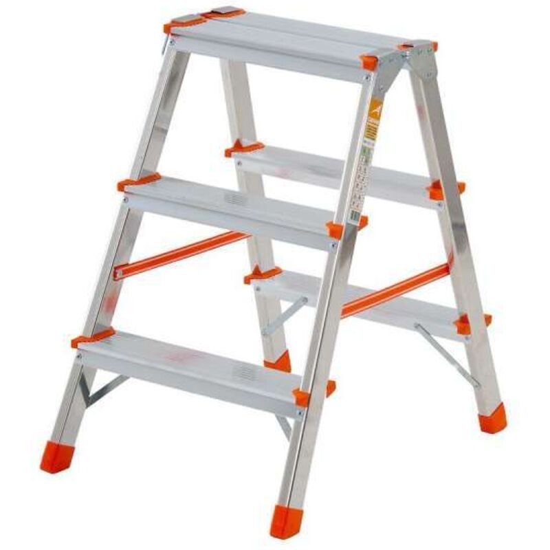 In alluminio. Leggerissimo, piedini antiscivolo e corda di sicurezza anti apertura ad alta tenuta. Superficie gradini da 8 cm di larghezza, profilo 20x40 mm. Conforme alle norme vigenti EN131 D.Lgs 81/08. Portata Kg 150. Made in Europe.