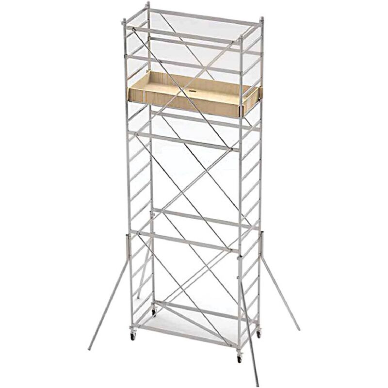 La torre mobile in acciaio leggero 'Selfix' è uno strumento di lavoro in altezza versatile e robusto. In sintesi, la torre mobile 'Selfix' è uno strumento di lavoro in altezza di alta qualità, che offre una serie di caratteristiche di sicurezza e funzionalità. La sua conformità alle normative europee e nazionali, insieme alla sua resistente struttura in acciaio, la rendono adatta per una vasta gamma di applicazioni. Caratteristiche: Struttura zincata elettroliticamente: La struttura è zincata elettroliticamente per proteggerla dall'anticorrosione atmosferica. Questo processo di zincatura offre una maggiore durata alla struttura, specialmente se utilizzata in ambienti esterni o esposti agli agenti atmosferici. Montanti in acciaio 38x1,2 mm: I montanti, realizzati in acciaio, forniscono una solida base per la torre. La dimensione di 38x1,2 millimetri assicura resistenza e stabilità alla struttura. Pioli rettangolari 40x20 mm: I pioli rettangolari, con dimensioni di 40x20 millimetri