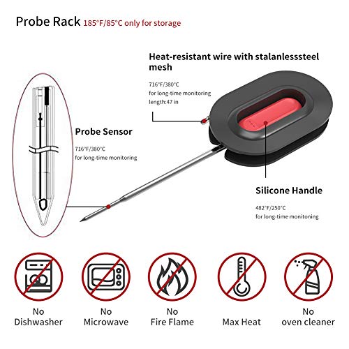 RESISTENZA AL CALORE: Le sonde possono monitorare temperature fino a 572 ℉ / 300 ℃ per il monitoraggio a lungo termine. Filo e manico possono resistere fino a 716 ℉ / 380 ℃ come per griglia e fumi estremi e la sua precisione di lettura è A +/- 1%.