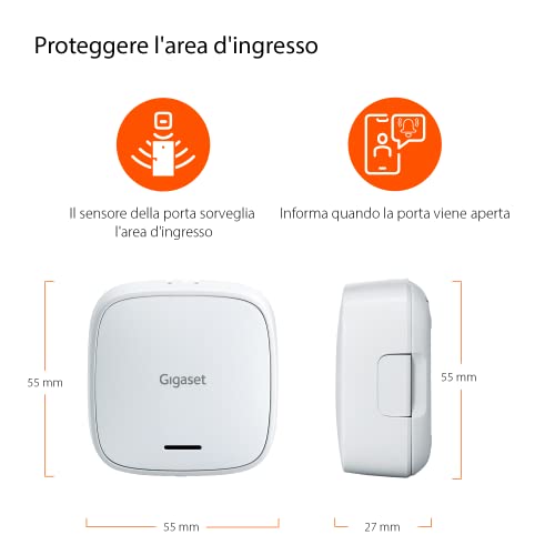 FORNITURA - 1x sensore porta Gigaset ONE X, 1x sirena d'allarme Gigaset ONE X, 1x base Gigaset, 1x batteria al litio CR123A da 3 volt, 2x strisce adesive, 1x supporto a muro, 1x cavo Ethernet, 1x alimentatore a muro