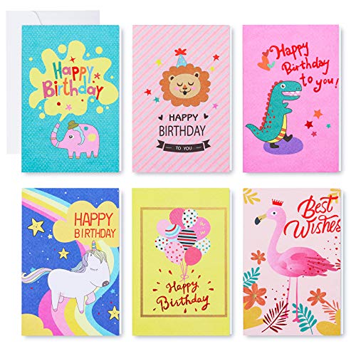 Giiffu Biglietti di compleanno per bambini, 24 biglietti colorati con animali con buste (dinosauri, unicorni, fenicotteri, elefante, leone, palloncino), carini biglietti di auguri di compleanno