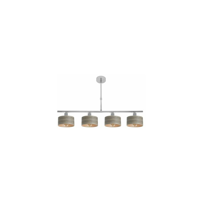 Lampada a quattro luci della serie GILDA colore CROMO/GRIGIO LEGNO. È costituito da schermi in metallo e materiale tessile. Dispone di quattro portalampada E14. Lampadine non incluse. Dal design moderno, predominano i suoi paralumi con tessuti color legno, molto in sintonia con decorazioni naturali, minimaliste e compatibili anche con ambienti Vintage. Ideale per l'illuminazione di camere da letto, soggiorni, sale da pranzo e aree di lavoro. Ha dimensioni, regolabili in altezza, di 39