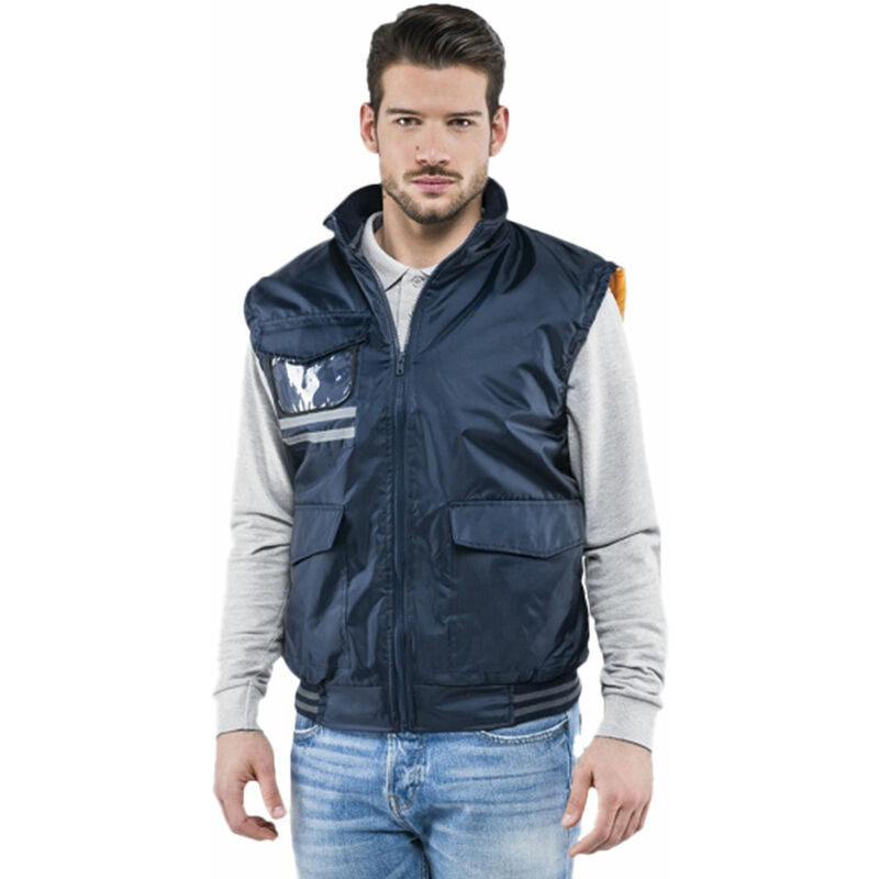 In 100% poliestere. Con 2 tasche centrali, tasca sul petto, pattina e tasca porta badge. Giromanica con elastico, fodera interna. Chiusura zip. Peso 160 gr/m2. DPI I categoria rischi minimi, conforme UNI EN 14058.
