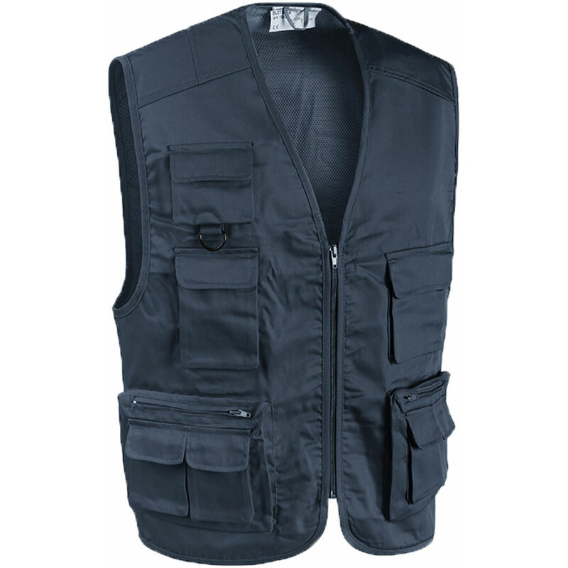 In 80% poliestere e 20% cotone. con 8 tasche esterne, 2 tasche posteriori, tasca porta cellulare. retinatura interna, collo a v, chiusura centrale con zip. peso 200 gr/mq. protezione ce i categoria rischi minimi.taglia l - grigio