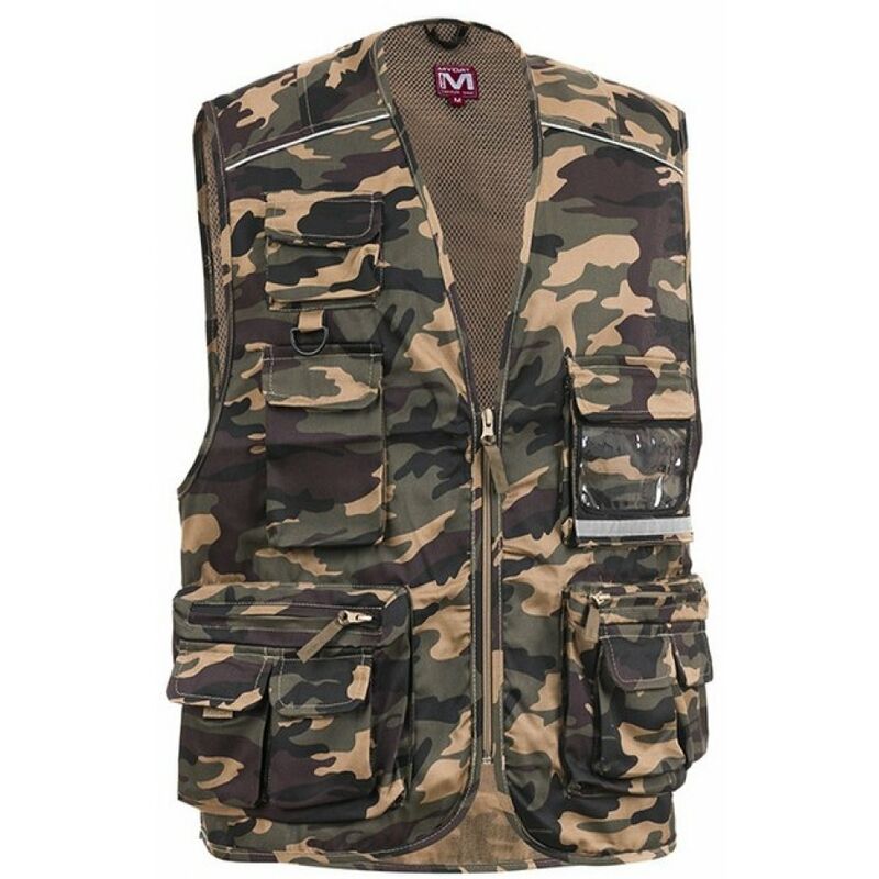 80% poliestere, 20% cotone, collo a V, 8 tasche esterne, 2 tasche posteriori, porta-badge estraibile, dettagli color argento fluo. Col. Camouflage Mimetico