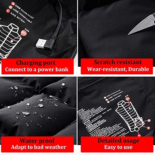 【Ricarica USB】Il gilet riscaldante elettrico è dotato di una porta USB. Si consiglia di utilizzare un power bank da 5V/2A e oltre per la ricarica. La porta di ricarica USB è compatibile con la maggior parte delle fonti di alimentazione mobili sul mercato. (Nota: il power bank non è incluso, è necessario preparare il proprio alimentatore mobile)