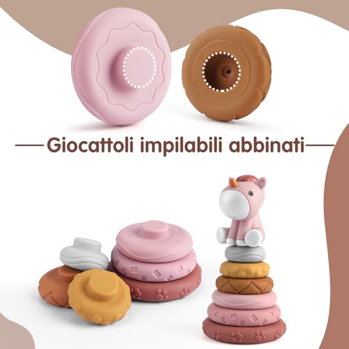 Giocattolo impilabile per cavalli: il giocattolo impilabile ha sei cerchi di diverse dimensioni e un grazioso cavallo rosa sulla parte superiore. L'aspetto color caramella, i suoni divertenti possono attirare l'attenzione del bambino, e i motivi e i motivi irregolari sulla superficie aiutano i bambini a sviluppare il senso del tatto. Un giocattolo indispensabile per i bambini