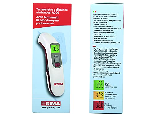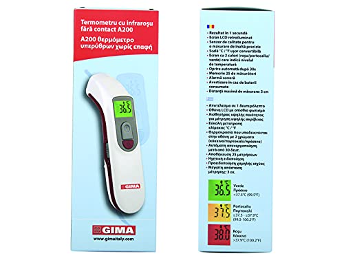 GIMA - Termometro Infrarossi Frontale Laser Digitale Professionale, per Febbre, Istantaneo, Senza Contatto, per Neonati, Bambini e Adulti, Thermoscanner con Allarme, 2 AAA incluse, lingue IT,GR,RO,PL
