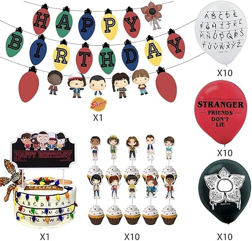 Contenuto della confezione: questo set di decorazioni per feste di compleanno a tema Strangers include banner di buon compleanno e banner di cartone animato, grande decorazione per torte, topper per cupcake e palloncini