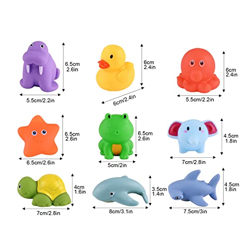【Vari stili】 Riceverai 9 diversi stili di giocattoli in gomma, tra cui stelle marine, tartarughe, rane, leoni marini, elefanti, delfini, anatre, squali, 2 giocattoli galleggianti azionati da un meccanismo a orologeria e una rete da pesca, lascia che il tuo bambino si diverta tempo del bagno!