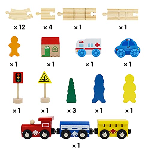 Vari Accessori: questi pista macchinine hanno 33 accessori, inclusi 18 pezzi di treno in legno, 5 vagoni, 3 immagini di persone e altri accessori. 3 macchinine colorate possono essere collegate con il magnetico per formare un lungo treno. I bambini possono utilizzare questi puzzle di legno per costruire il proprio treno, come il binario "8", rotondo e ovale.