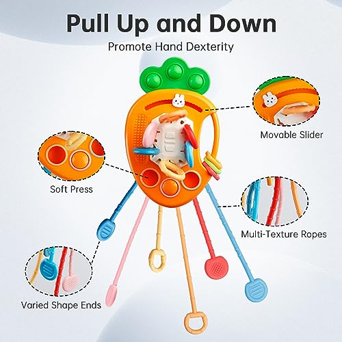 【Gioco di Tirare con Cordoncino Sensoriale】Il carino giocattolo a forma di carota con cordoncino è dotato di sei cordoncini in silicone di diverse colorazioni e trame, che i bambini possono premere e tirare in modi diversi per sviluppare la loro forza. Un lato è dotato di un bottone e tre buchi per sviluppare la destrezza delle dita e la coordinazione occhio-mano. È anche un giocattolo sicuro e morbido da mordere per i bambini di età compresa tra 6 e 12 mesi.