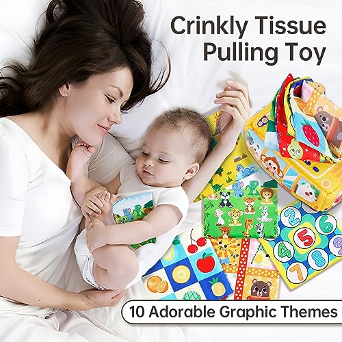 ❤️【Gioco Montessori Scatola di Fazzoletti】Giochi sensoriali con scatola porta-fazzoletti per bambini dai 6-12 mesi, dotato di 1 scatola porta-fazzoletti e 5 rotoli di carta crespa con 10 motivi a doppia faccia. Tra cui geometria, numeri, animali, veicoli, oceani, frutta, promuovendo lo sviluppo delle abilità legate ai numeri. Aiuta i bambini a tirare, strappare