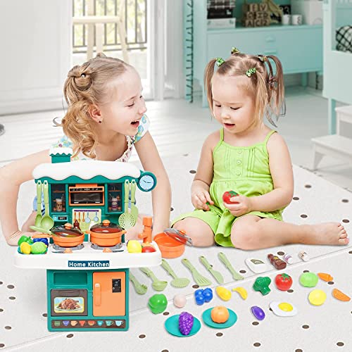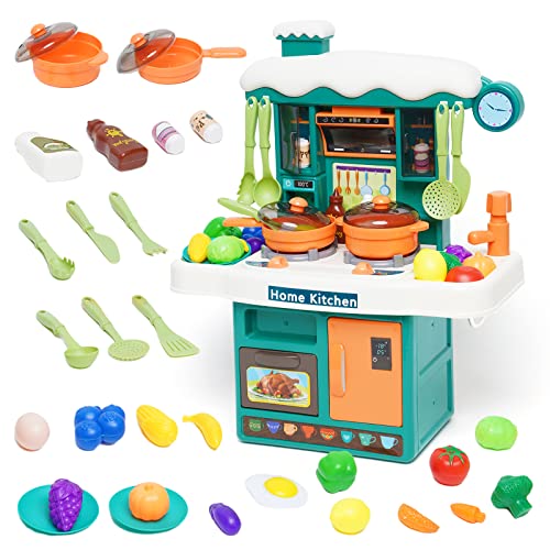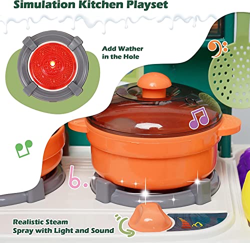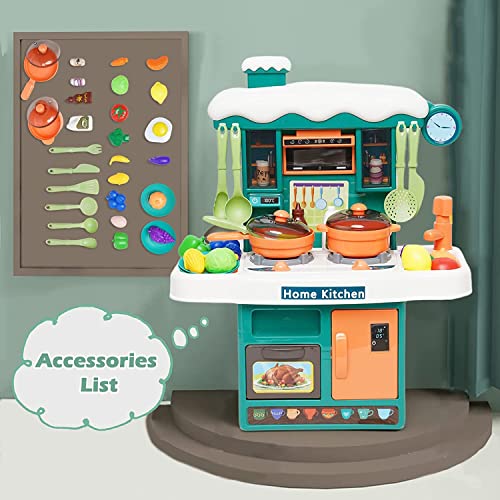 【31 accessori da cucina】 Il nostro set da cucina è dotato di ricchi accessori, tra cui adesivi, stoviglie, fornello con luci e suoni e spray, forno, pentole e padelle, frutta, verdura, ecc. I bambini possono partecipare rapidamente al gioco di ruolo con questi strumenti.