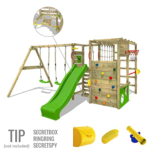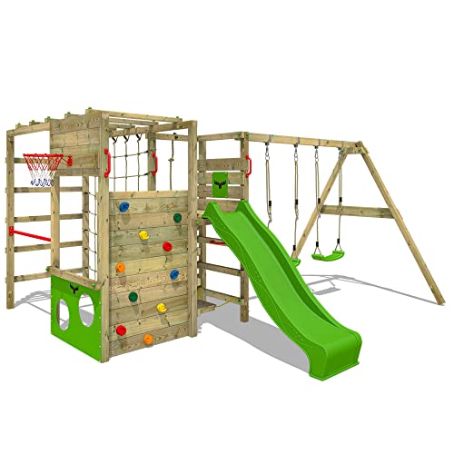 Gioco da giardino FATMOOSE ActionArena Air con altalena e scivolo verde mela, struttura da esterno per bambini con canestro da basket, scaletta e accessori per il gioco