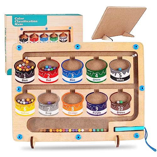 Gioco magnetico per bambini piccoli: modo pratico per scoprire colori e numeri. Il nostro robusto labirinto di legno ha 10 "barattoli di colore" incorporati, che rappresentano i numeri da 1 a 10 e 55 perline magnetiche in 10 colori vivaci che i bambini possono contare.