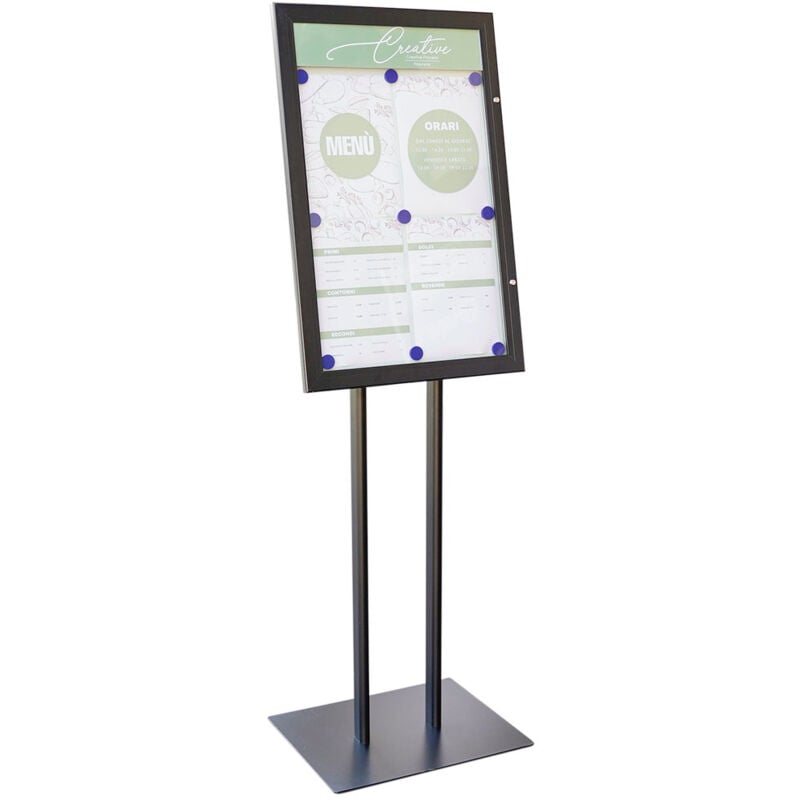 Espositore a Leggio Espositore a Leggio con Piantana 51,4x79 cm in Alluminio Porta Menù Nera L'espositore a leggio per esterni è realizzato in alluminio autoportante, con una base solida e doppio montante di dimensioni 55x25 mm. La sua elegante finitura nera, ottenuta mediante verniciatura a polveri, lo rende adatto ad ogni tipo di ambiente. Il fondo del leggio è magnetico e scrivibile, ideale per fissare e annotare fogli o appunti. L'anta in policarbonato trasparente consente una visibilità ottimale dei contenuti esposti. Inoltre, l'espositore è dotato di un'apertura a libro con doppia serratura e chiavi in dotazione, garantendo un elevato livello di sicurezza. Il pannello di intestazione può essere personalizzato con il logo o essere completamente removibile. Le dimensioni della cornice sono 51,4x79 cm, mentre quelle della struttura sono 51x163 cm. Caratteristiche Tecniche Espositore a Leggio per esterni Autoportante base e doppio montante Colore: verniciato a polveri nero Fondo in