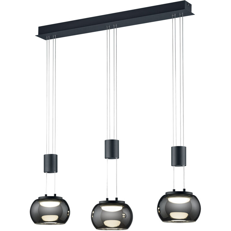 Lampada a Sospensione Lampada a Sospensione da Interno a LED in Alluminio Nero Opaco Madison Sospensione Led Barra Metallo Nero e 3 Vetri Sfera Fume' Cromati con Regolazione Altezza con Contrappeso e Dimmerazione Intensità con Normale Interruttore A Parete L. 82Cm Caratteristiche Tecniche Stile Moderno Fonte di luce principale: Inclusa a LED Materiale: Alluminio Colore Finitura: Nero opaco Potenza (W): 8 Lumen: 900 Kelvin: 3000K Alimentazione (V): 230 Durata Nominale (h): 30000 Numero Accensioni: 15000 Classe energetica: F Larghezza (cm): 82 Altezza (cm): 150 Profondita (cm): 18 Peso netto (kg): 4,2