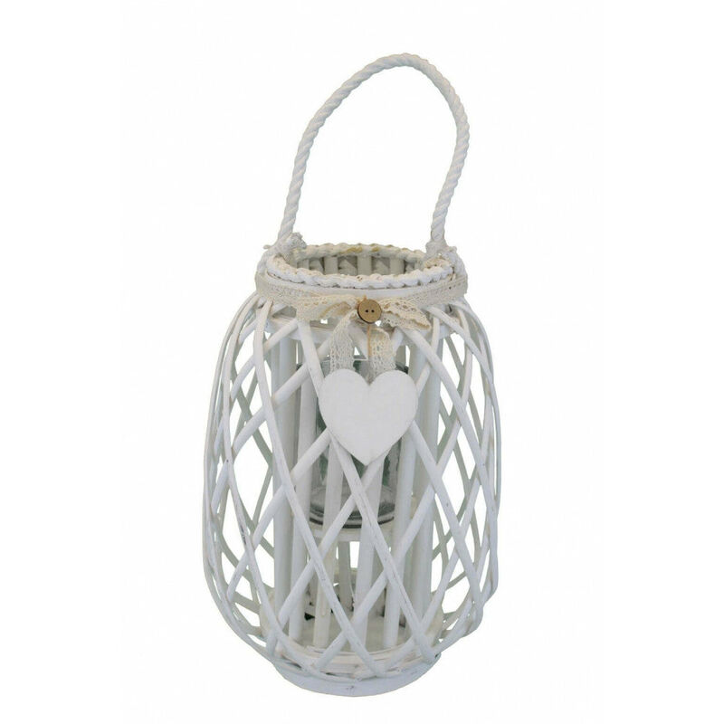 Lanterna Lanterna Flavienne in Vimini Bianco Lanterna BIANCA in vimini e vetro con nastro in pizzo e decoro a cuore Dimensioni: Top Ø14x35 h cm - Centrale Ø24x35 h cm - Vetro Ø10x12 h cm Colore: Bianco