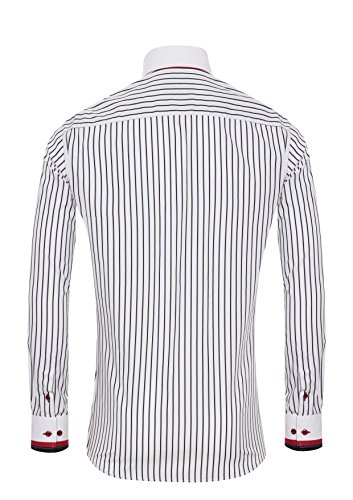 Questa camicia bianca con sottili righe nere sorprende grazie ai suoi dettagli raffinati: colletto Giorgio Capone bianco con righe rosso-nero e tre bottoni rossi per lato, motivo paisley nero-bianco all'interno del colletto e sotto la fila di bottoni, asole e bottoni rossi, polsini combinati in bianco con bordatura rosso-nero. Una vera affermazione di stile, sotto un abito nero, una giacca rossa o un giubbetto nero di pelle.