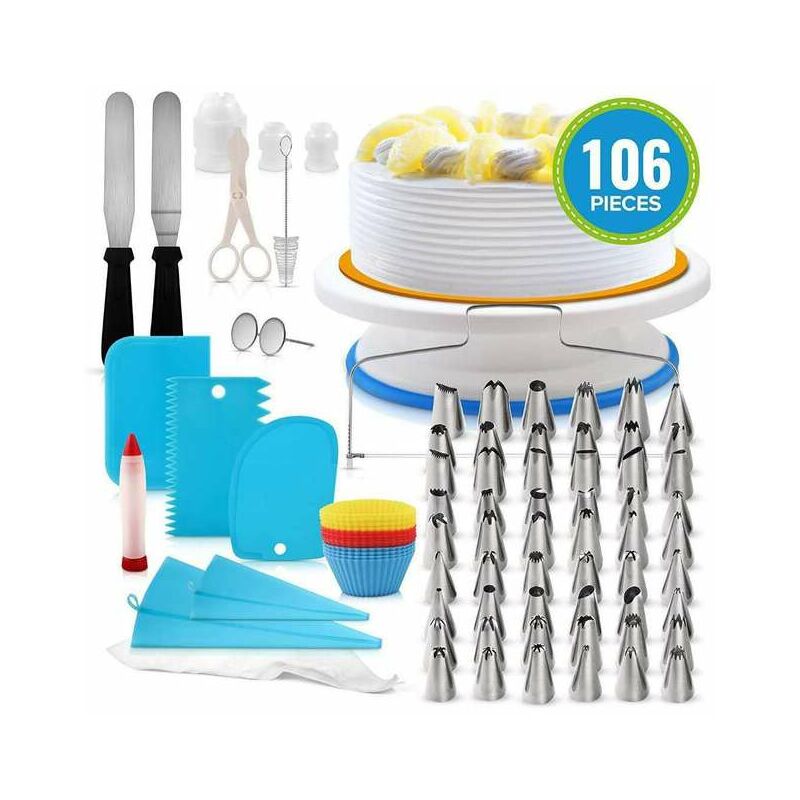 Giradischi per decorare torte ruota senza intoppi con cuscinetti a sfera nascosti e ti aiuta a decorare facilmente torte per compleanni, matrimoni e altri eventi. Ruota l'orologio e l'orologio saggio, buono sia per le mani destra che sinistra. Utilizzare una spatola dritta per la glassa di torte rotonde dai lati e una spatola angolata dall'alto mentre giradischi rotante. Il supporto per giradischi per torta è realizzato in plastica ABS e silicone per alimenti, non appiccicoso, non tossico e lavabile in lavastoviglie. Ideale per principianti e per professionisti. Giradischi girevole Super liscio leggero e resistente! Design antiscivolo: la base rialzata da 3 pollici ha anche un bordo antiscivolo per mantenere il giradischi in movimento sulla superficie di lavoro. All-in-one 106 pezzi di forniture per la decorazione di torte: include 48 * piccole punte per glassa, 6 * grandi punte per glassa, 25 * borsa per tubi usa e getta, 12 * tazza per torta, 3 * raschietto per torta, 2 * piccolo
