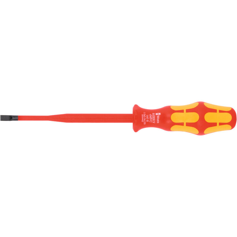 la rigidità dielettrica dell'isolamento equivale a un multiplo della tensione minima di prova secondo norme di sicurezza VDE. Ognuno di questi giravite è collaudato singolarmente in bagno d'acqua per verificarne la resistenza. L'impugnatura Kraftform in plastica resistente agli urti, con zone morbide integrate facilita la trasmissione del momento torcente e pertanto non stanca né mano né braccio. Lama in acciaio speciale altamente legato con tagliente conico, fosfatato allo zinco. ⌀ Ridotto della lama con isolamento di protezione integrato per morsetti a vite e a molla in profondità (⌀ Lama = ⌀ Isolamento nella parte anteriore della lama). Uso: Per lavori su impianti elettrici in tensione fino a 1000 V. La