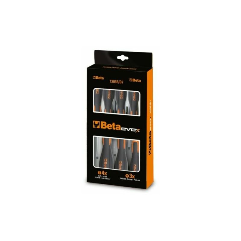 Serie di 8 giravite art. 1201E, 1202E 1201E: giravite lama piatta 0,5x3x75-0,8x4x125-1,0x5,5x150-1,2x6,5x150 mm 1202E: giravite Phillips® PH0x3x60-PH1x4,5x80-PH2x6x100-PH3x8x150 mm Giravite Evox per viti, cromati punta nera L'evoluzione del giravite! Caratteristiche: • Impugnatura bimateriale per trasmettere il massimo della forza con il minimo sforzo e il miglior comfort possibili • Il design ergonomico si adatta perfettamente al palmo della mano • Impronta e misura sono riportate sulla calotta sferica per una rapida individuazione • Le collaudate lame Beta offrono elasticità, durezza e resistenza all'usura ai vertici della categoria dei cacciavite professionali • La punta è priva di cromatura per garantire un perfetto accoppiamento con la vite ed è protetta dall'ossidazione con un trattamento di fosfatazione