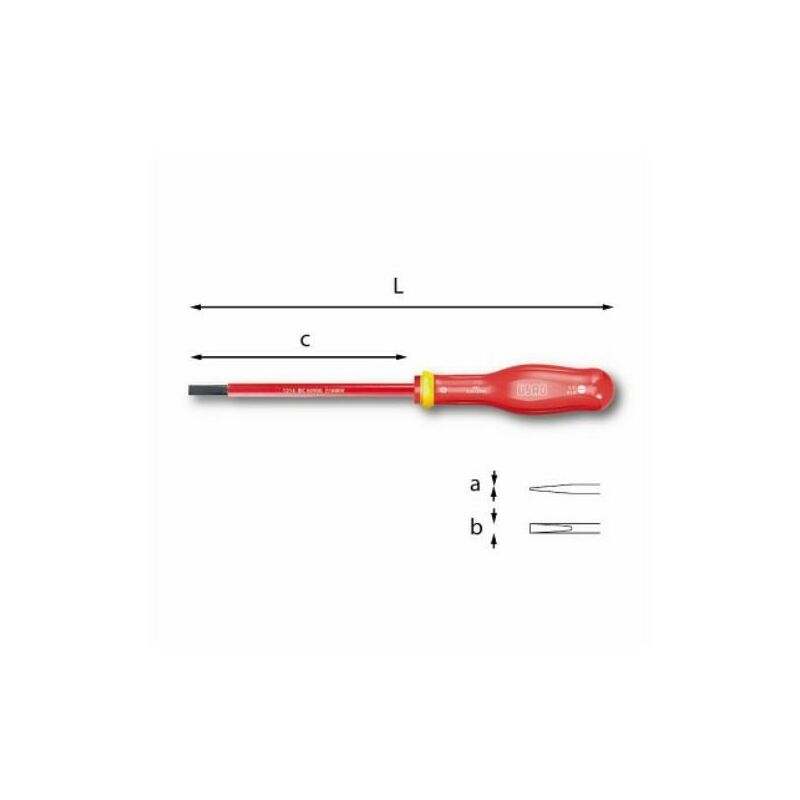 • Lama in acciaio caricato al Silicio, Manganese e Molibdeno con esecuzione fosfatata • Impugnatura ergonomica trimateriale isolata con rivestimento soft grip, resistente ad olii ed agenti chimici • Codice colore sull'impugnatura per distinguere le diverse impronte • Ogni giravite è testato secondo la normativa europea EN 60900 per garantire il lavoro in sicurezza • Certificazione IMQ Dimensioni (mm): L 259 - a x b x c: 0,8 x 4 x 150