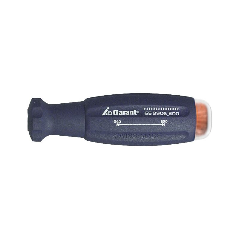 DescrizioneEsecuzione:Impugnatura robusta con superficie ipoallergenica e antiscivolo in Haptoprene® che consente di trasmettere la coppia necessaria senza sforzo, anche con mani bagnate o sporche di olio. Raggiunto il valore di coppia impostato, il giravite rilascia un segnale sonoro e tattile ed è subito pronto all'uso. La coppia di allentamento è maggiore della coppia di serraggio (protezione contro i sovraccarichi).Impostazione della coppia desiderata mediante apposita rotella sull'estremità dell'impugnatura. La posizione di arresto evita le manipolazioni indesiderate. Scala micrometrica di facile lettura e protetta dallo sporco.Per l'alloggiamento di lame intercambiabili da 6 mm (n. art. 659920 − 659928).Norma:Collaudata a norma DIN EN ISO 6789.Nota:La precisione di misurazione garantita della coppia è possibile a partire dal campo di coppia tarato secondo DIN EN ISO 6789.Dati tenici Coppia max. 200 cN·m Direzione di serraggio Serraggio orario Precisione di misura della coppia ±6