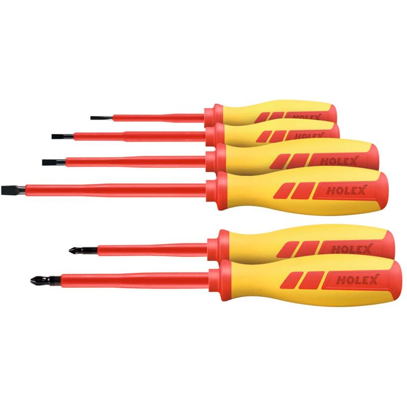 Robusta impugnatura multicomponente ergonomica per momenti torcenti elevati. Lama in acciaio per utensili altamente legato, completamente isolata fino a 1000 V a norma DIN EN 60900 / VDE 0682-201. Fornitura: Cad. 1 giravite per viti con intaglio n. art. 663301 Dim. 2,5;