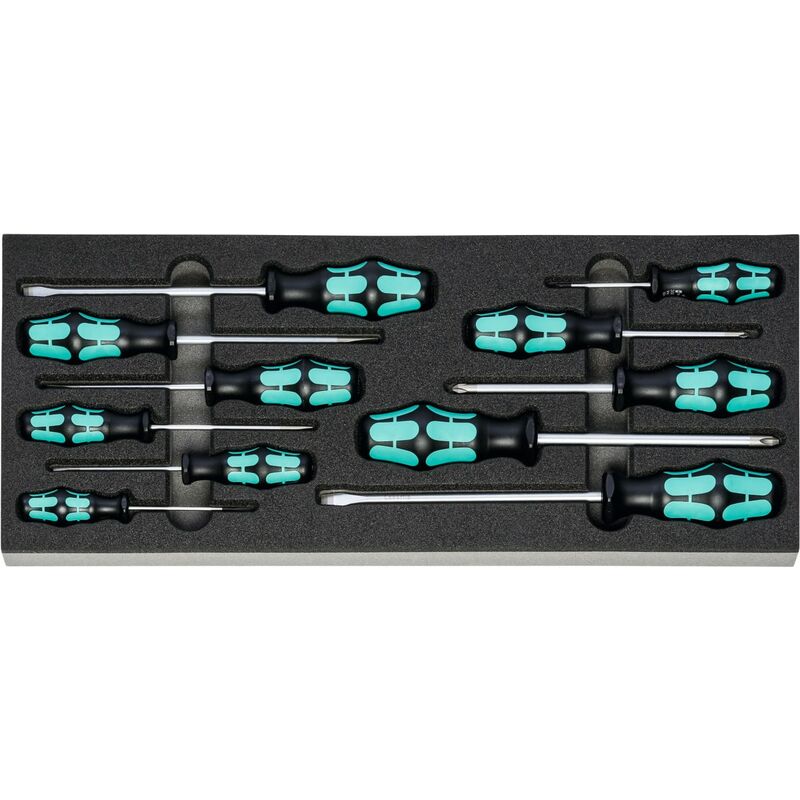 Assortimenti standard di utensili in alloggiamenti in espanso rigido bicolore in PE. La struttura non porosa dell'espanso è impermeabile e resistente agli oli. Strato superiore color antracite, quello inferiore di contrasto color grigio mette in evidenza gli utensili mancanti. Fornitura: Inserto in espanso rigido vuoto n. art. 952001 Dim. 953438: 1 pz. Giravite per viti con intaglio di WERA n. art. 662200 Dim. 2,5;