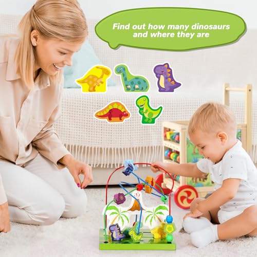 6 IN 1 Giochi Montessori 1 Anno: Gioco bambino 1 anno 2 anni contiene 5 tipi di giochi, con un labirinto di perline sulla parte superiore per esercitare la destrezza delle manine del bambino, un abbinamento di dinosauri per identificare e riconoscere le forme e i nomi dei dinosauri, un orologio con faccina sorridente per aiutare il bambino a imparare l'ora, che è un grande giocattolo educativo per i bambini.