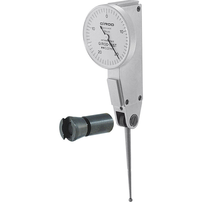 Tastatori a leva di alta precisione con meccanismo montato su rubini in esecuzione robusta e funzionale. Il corpo e i prismi a coda di rondine sono realizzati in un pezzo unico, assicurando la massima rigidità. Protetto contro la corrosione grazie alla cromatura opaca della cassa. Comparatori a leva con asta tastatrice lunga. Lettura 1/100. GIROD − Meccanismo montato su rubini con sfera di misura in HM. Cassa robusta, insensibile ai campi magnetici. Swiss Made. Uso: Verificatore di alesaggio di precisione per controllare l'errore rispetto alla misura nominale nei controlli di rotazione concentrica, nelle misurazioni di interni, nei controlli di parallelismo e di planarità e per l'allineamento di pezzi. Fornitura: Incluso codolo di serraggio ⌀ 8 mm. Accessori speciali: Supporto quadro n. art. 436510, supporto di centraggio n. art. 436512, supporto articolato portacomparatori n. art. 359680. Ricambi: Punta tastatrice di ricambio con sfera in HM o di rubino disponibile su richiesta.