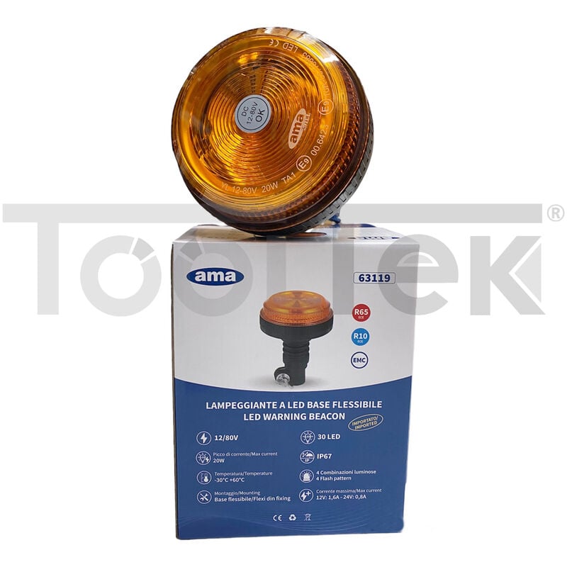 Girofaro a led base flessibile 12-24V AMA CARATTERISTICHE: Classe di protezione: IP67 30 LED Quattro tipologie di flash: Flash singolo, Doppio flash, Quad flash, Mega flash. Assorbimento corrente 12V-24V: 1,6A, 0,8A. Picco di potenza: 20W Temperatura di esercizio -30°C a 60°CBase imbuto flessibileCertificazione: ECE R10, ECE R65, EMC, CE Prodotto di qualità LA FATTURA VIENE EMESSA PER ACQUISTI SUPERIORI A 20 € E VA RICHIESTA NEL MOMENTO DELL' ACQUISTO