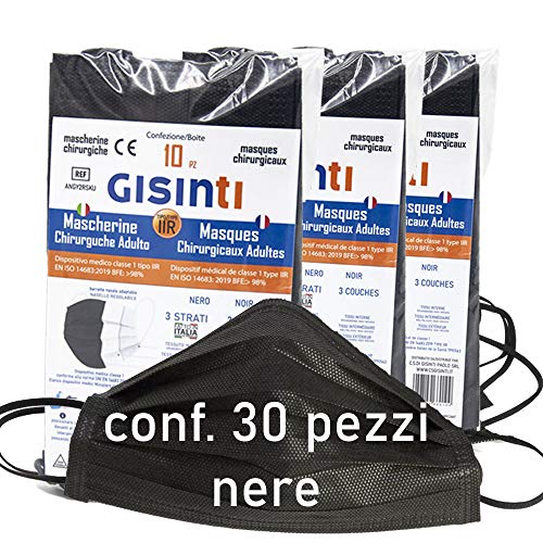 Gisinti Mascherina Chirurgica Nera Certificata Tipo IIR Made In Italy Dispositivo Medico Monouso Mascherina Certificata Adulto Conf.30 Pezzi Colore Nero