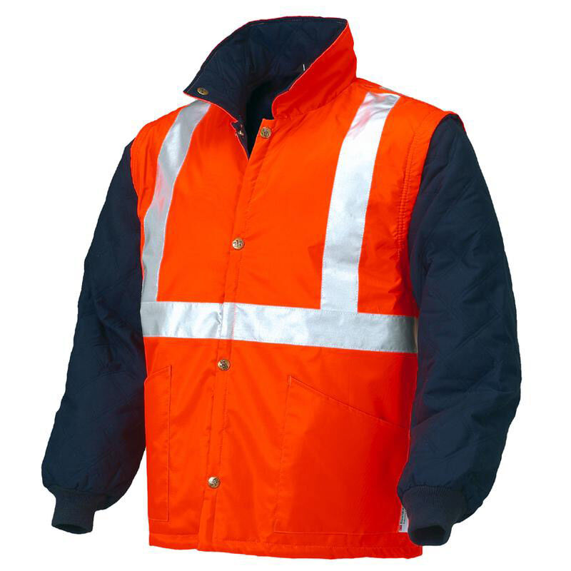 Gilet con maniche staccabili av en 471 arancio fluo o giallo fluo issa 04648n Gilet: Imbottito, tessuto fluorescente traspirante con applicate bande rifrangenti 3M Scotchlite, due tasche esterne e una interna, maniche staccabili trapuntate. Composizione: - Poliestere