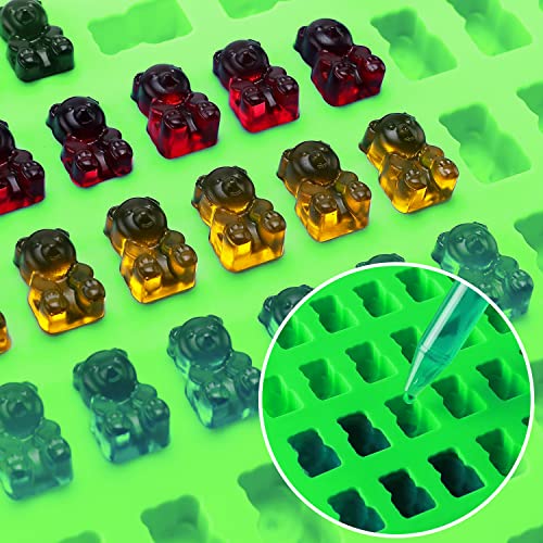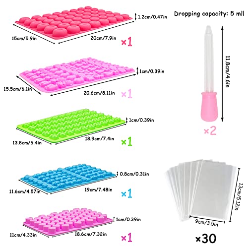 PACCHETTO: 5 stampi riutilizzabili in silicone gommoso di dimensioni mini e 2 contagocce per un facile riempimento e 30 sacchetti di caramelle.