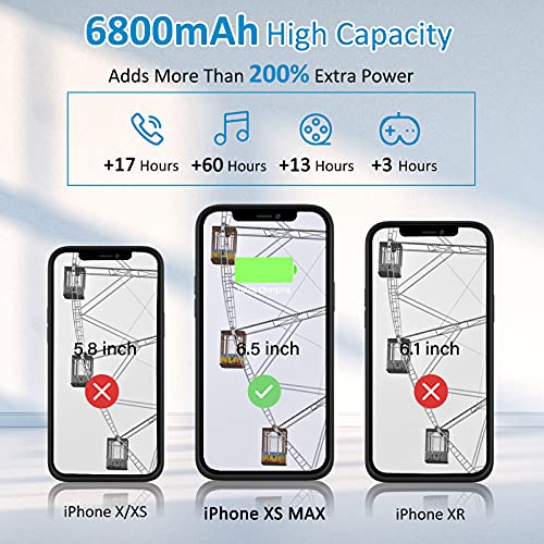 【Raddoppia la durata della tua batteria】Custodia di ricarica portatile protettiva ricaricabile da 6800 mAh per iPhone XS MAX. Fino al 200% della batteria standard offre 120 ore in più in standby, 17 ore di conversazione, 13 ore di video, 15 ore di navigazione sul Web o 3 ore di gioco sul telefono. Questa custodia per batteria può essere ricaricata in qualsiasi momento e ovunque, sarà la scelta migliore per viaggiare e lavorare.