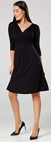 Vestito con maniche 3/4, taglio impero, caratterizzato dalle pieghe frontali. Romantico e chic! Abito in tessuto elastico. Collo a V con decorazione a portafoglio.